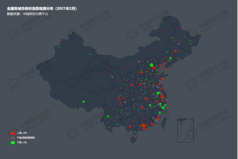 全国各城市房价涨跌地理分布图(2021年2月)