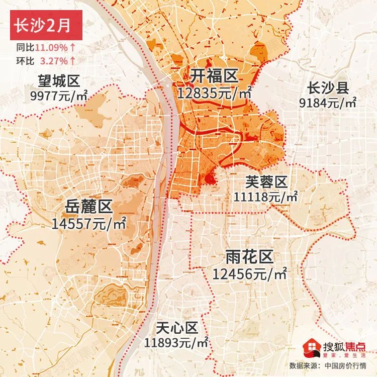 长沙2月均价为12119元/㎡同比上涨11.09%↑,环比上涨3.27%↑