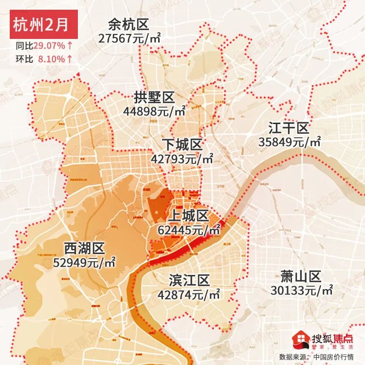 杭州2月均价为36546元/㎡同比上涨29.07%↑,环比上涨8.10%↑