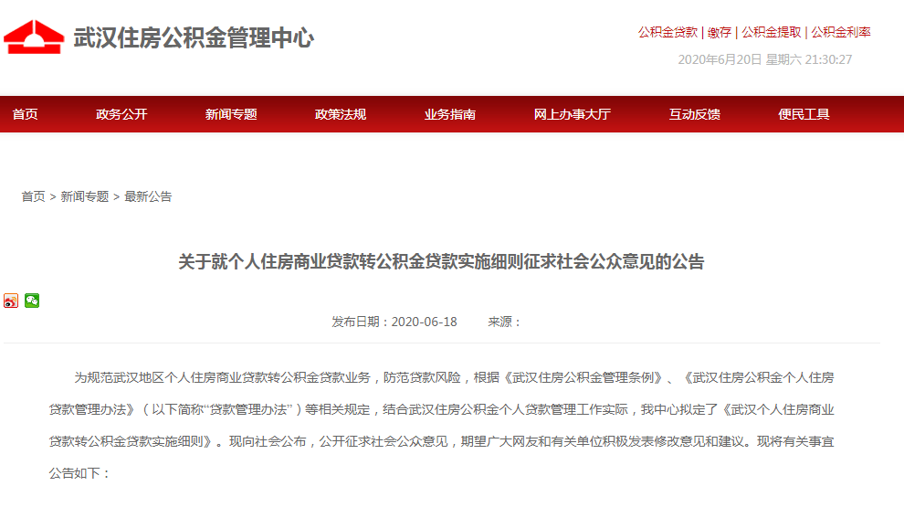 2020年6月18日,武汉住房公积金管理中心发布《关于就个人住房商业贷款转公积金贷款实施细则征求社会公众意见的公告》。