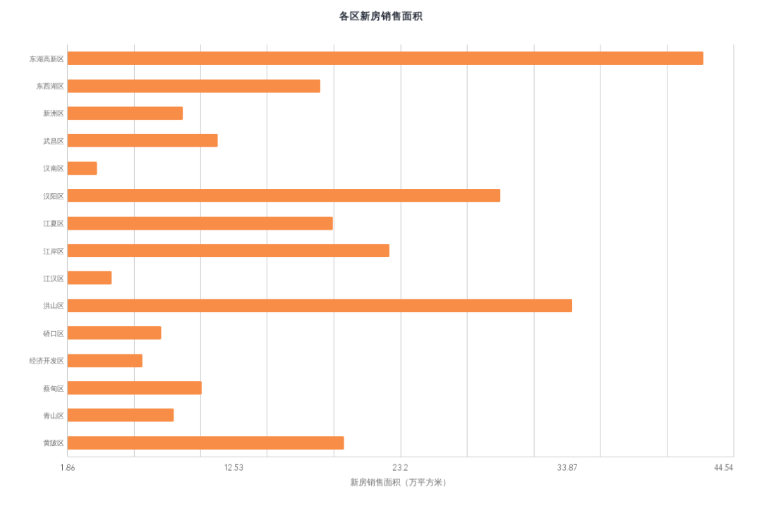 中心城区(含2个开发区)新建住房销售面积为168.4万平方米(占比67.7%),新城区销售面积为80.3万平方米(占比32.3%),其中东湖高新区和洪山区销售面积分别为42.6和34.2万平方米,居全市前2位。