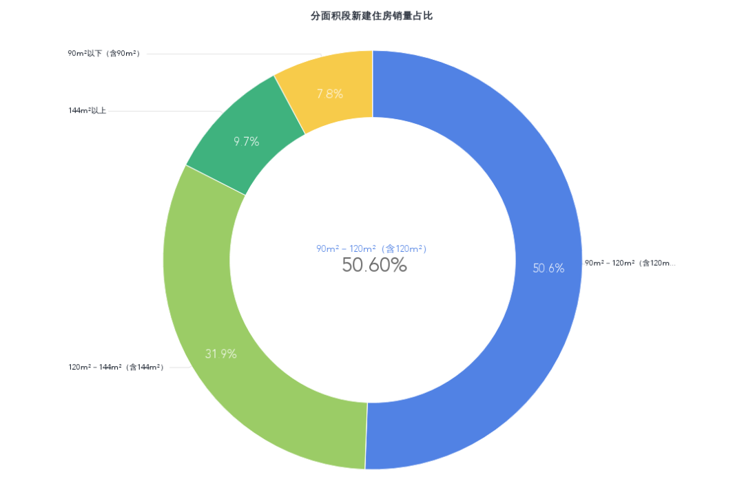 90㎡-120㎡面积区间的新建住房销量占比较大。90㎡-120㎡(含120㎡)的新建住房销量占比最大,为50.6%;90㎡以下销量占比较小,为7.8%。