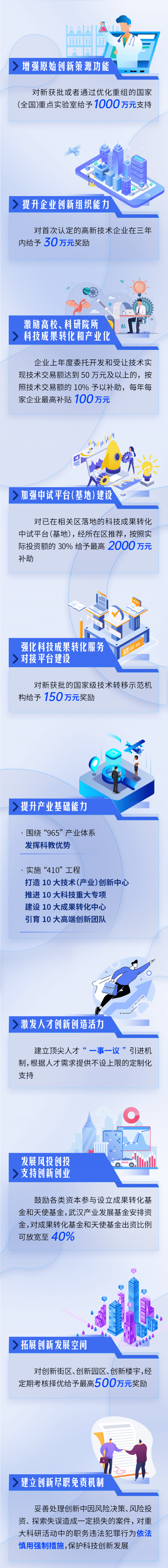 其中,为推进具有全国影响力的科技创新中心落实落地,把科技创新“关键变量”转化为高质量发展“最大增量”,武汉从10个方面制定《政策措施》鼓励创新发展。