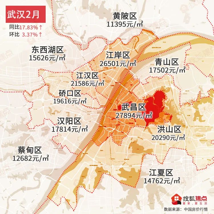 武汉2月均价为19992元/㎡同比上涨17.83%↑,环比上涨3.37%↑