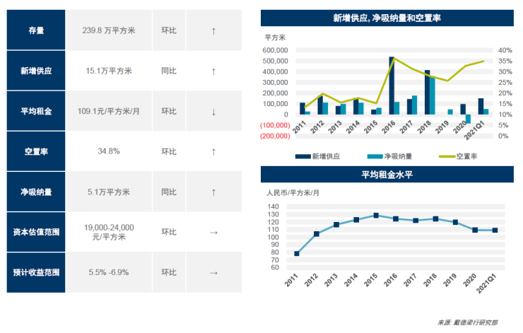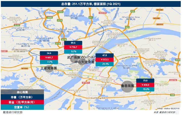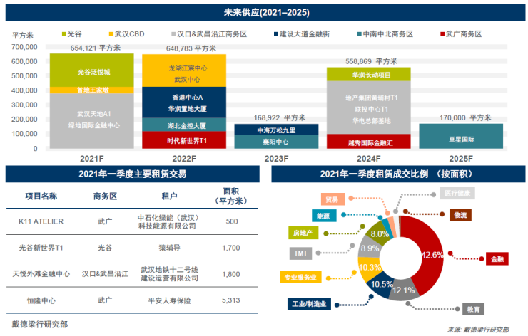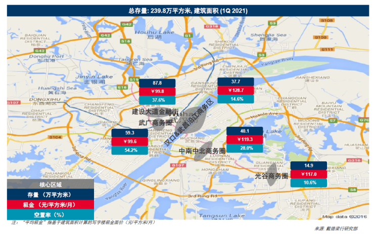 2021年一季度,恒隆中心的交付为武汉核心商务区甲级写字楼市场带来约15.1万平方米的甲级新增供应,推动全市甲级写字楼总存量至239.8万平方米。