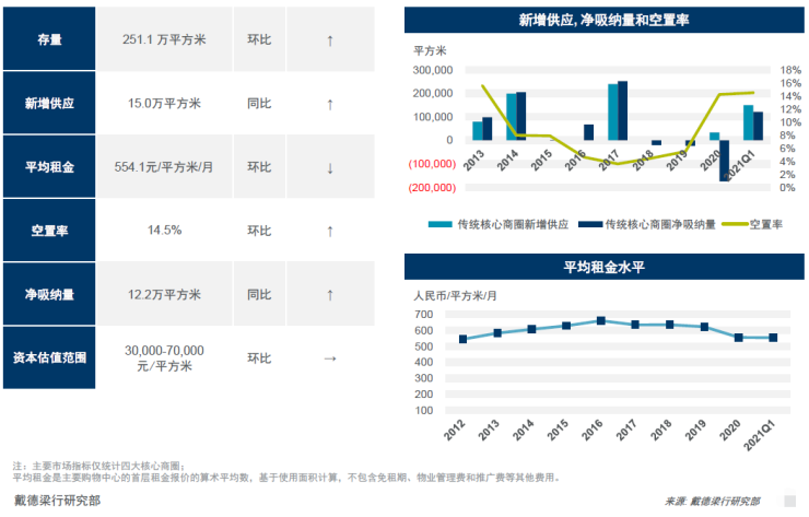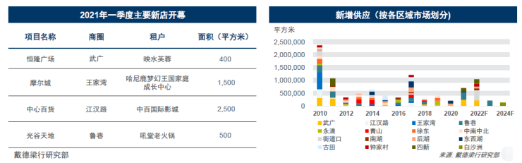 2021年一季度,恒隆广场的开业为武汉优质零售市场带来约15.0万平方米的优质零售新增供应。四大核心商圈优质零售项目总存量被推升至251.1万平方米。一季度,武汉各大商圈空置率保持稳定,