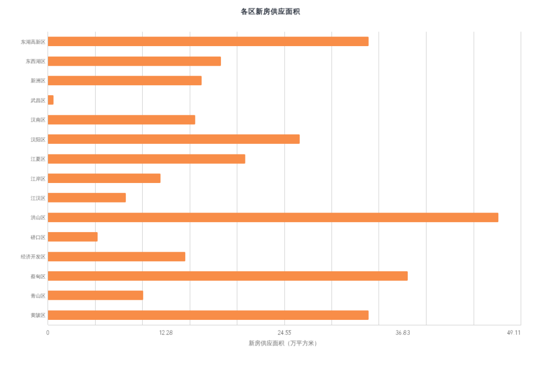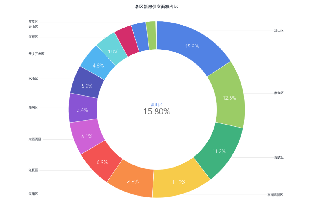 中心城区(含2个开发区)新建住房供应面积为156.2万平方米(占比52.7%),新城区供应面积为140.5万平方米(占比47.3%),其中洪山区和蔡甸区供应面积分别为46.8万平方米和37.4万平方米,居全市前2位。