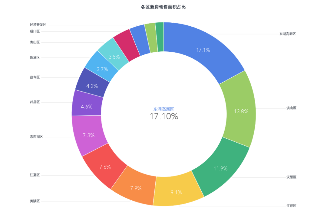 中心城区(含2个开发区)新建住房销售面积为168.4万平方米(占比67.7%),新城区销售面积为80.3万平方米(占比32.3%),其中东湖高新区和洪山区销售面积分别为42.6和34.2万平方米,居全市前2位。